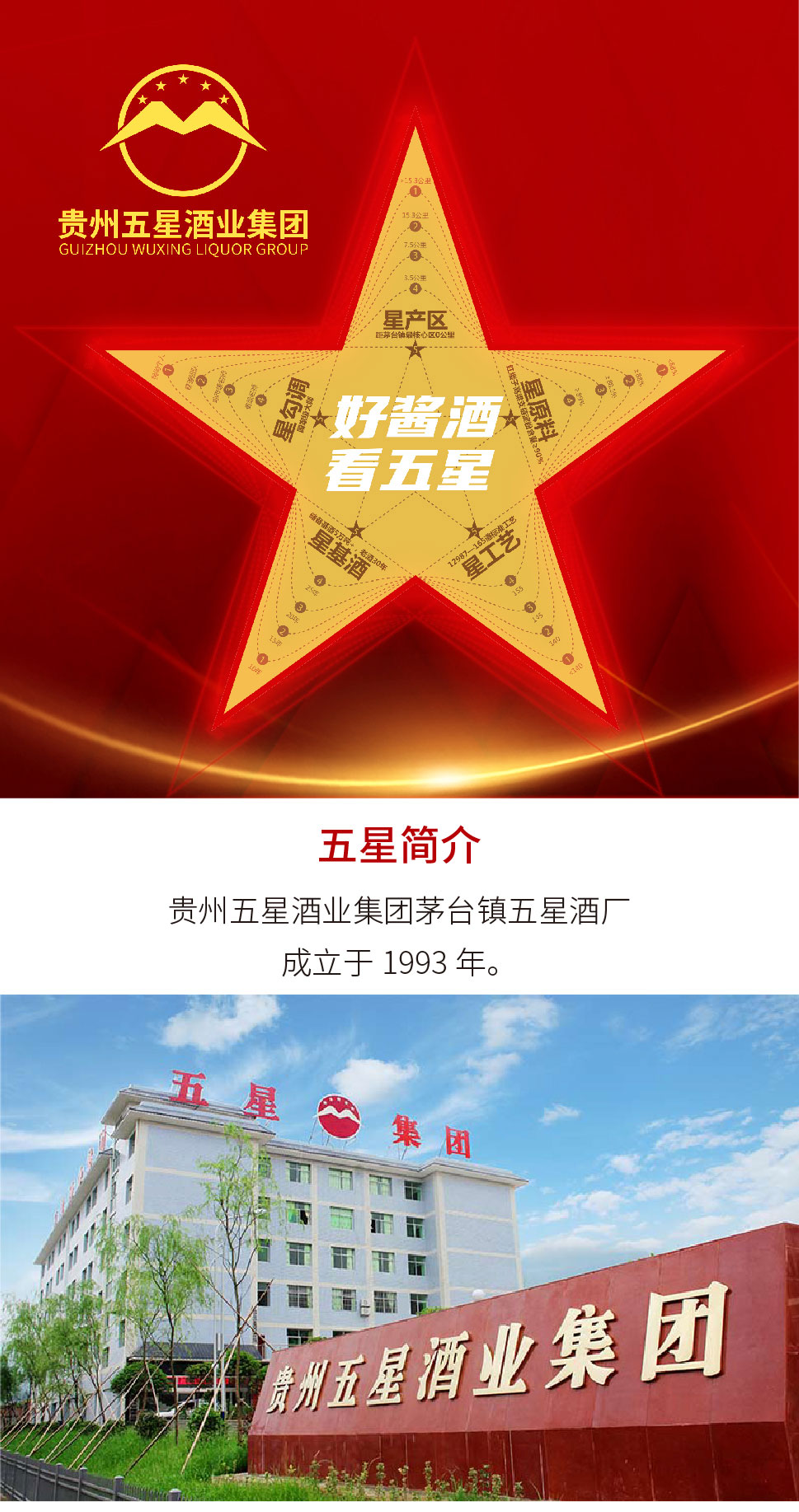 贵州五星酒业集团茅台镇五星酒厂成立于1993年,是“贵州民营企业100强”、“遵义市白酒工业十星企业”、“仁怀市十强民营企业”、“仁怀首家生态原产地保护产品认证”的民营企业!五星酒厂共有传统发酵窖池600多个,年生产优质酱香型白酒6000多吨,并配有5条现代化灌装和包装生产线,单日产量可达30000箱,近50000吨的基酒储存量,名列茅台镇前三甲!